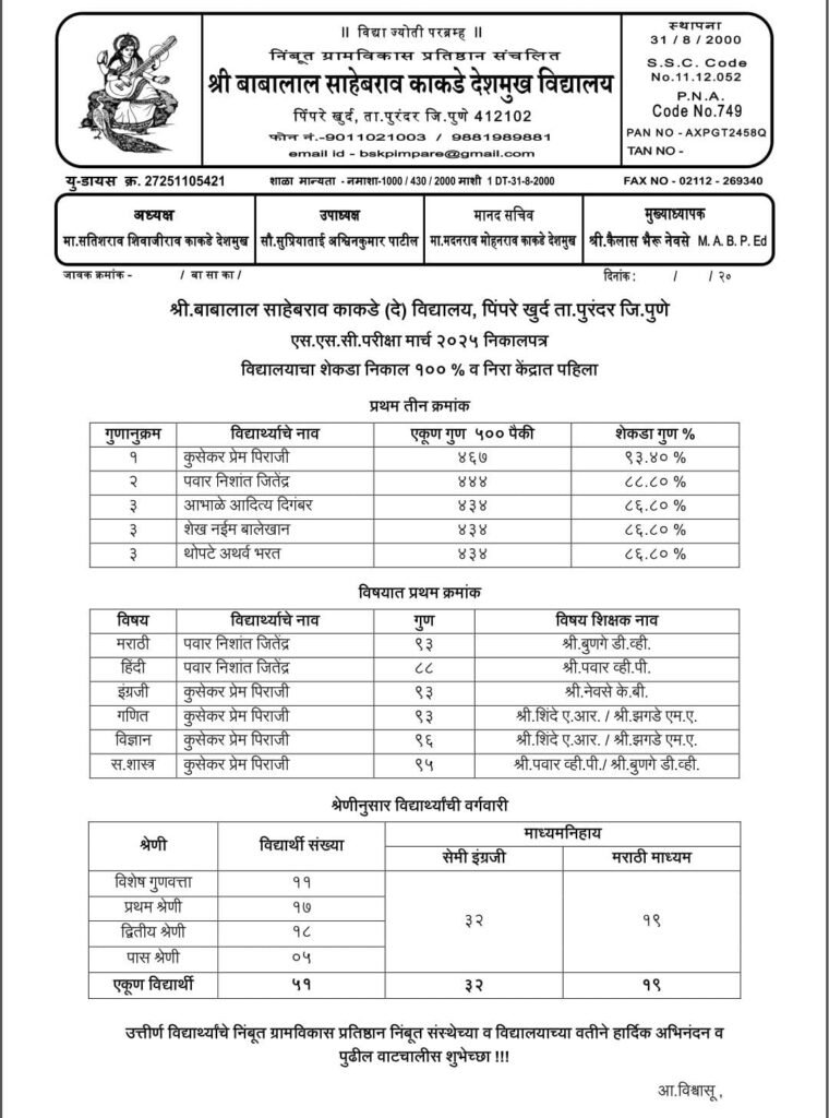 श्री बाबालाल साहेबराव काकडे देशमुख विद्यालय, निंबुत, ता–बारामती एसएससी बोर्ड परीक्षा विद्यालयाचा निकाल १००% , निकालाची परंपरा कायम, यंदाचाही निकाल शंभर टक्के…!!!